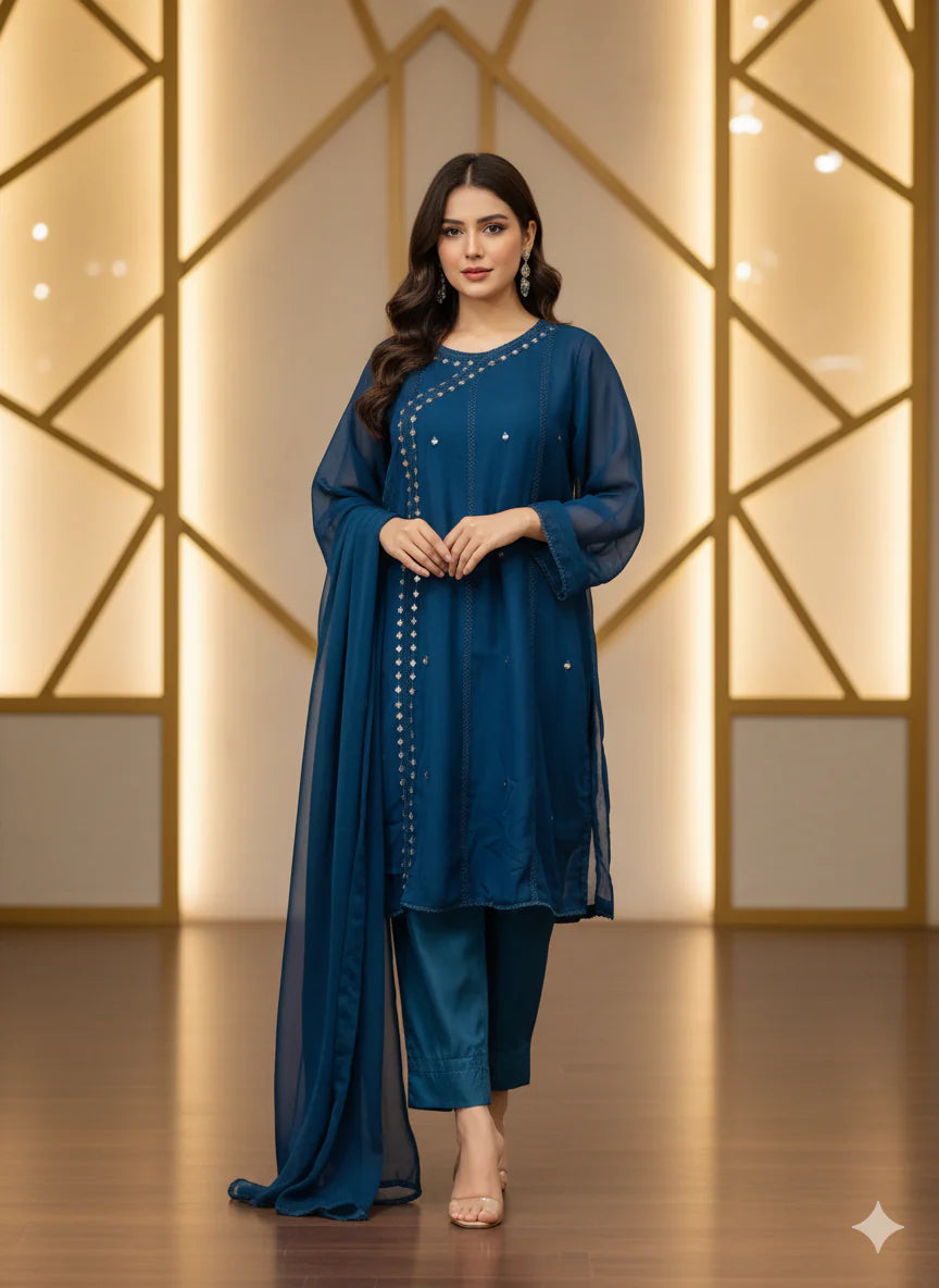 ✔ Design: A 3-piece set (kurta + trousers/shalwar+dupatta) with a tailored fit and contemporary silhouette.
