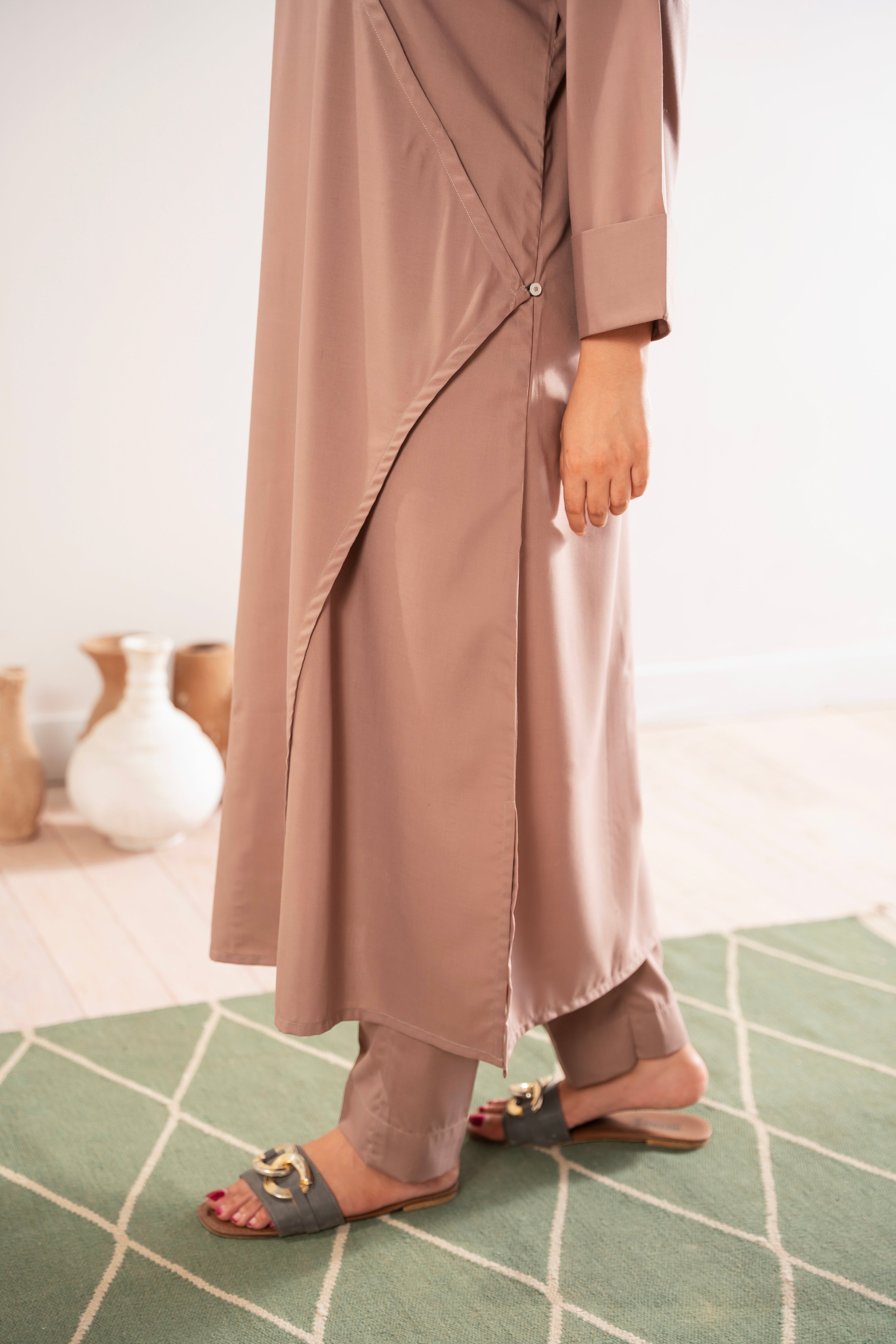 This two-piece dress includes a stylish frock and tailored trouser. This dress is crafted from our new soft crepe fabric, known for its sweat-absorbing properties, ensuring comfort throughout the day. Designed to blend contemporary Western styles with subtle traditional touches. The dress is shown here in size small, perfectly fitted on the model. Length of Shirt, Sleeve Opening & Shirttail are as per Design. Actual color may vary slightly from what appears on your screen due to lighting.