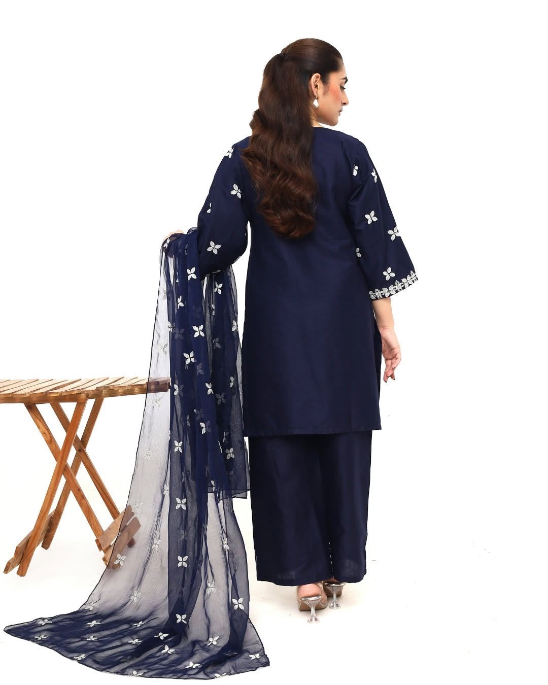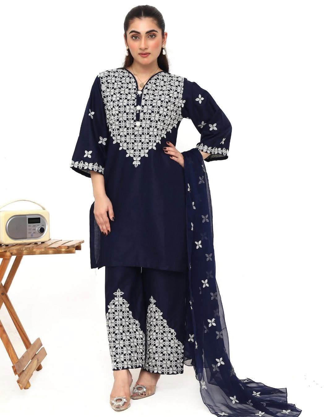 ✔ Design: A 3-piece set (kurta + trousers/shalwar+dupatta) with a tailored fit and contemporary silhouette.