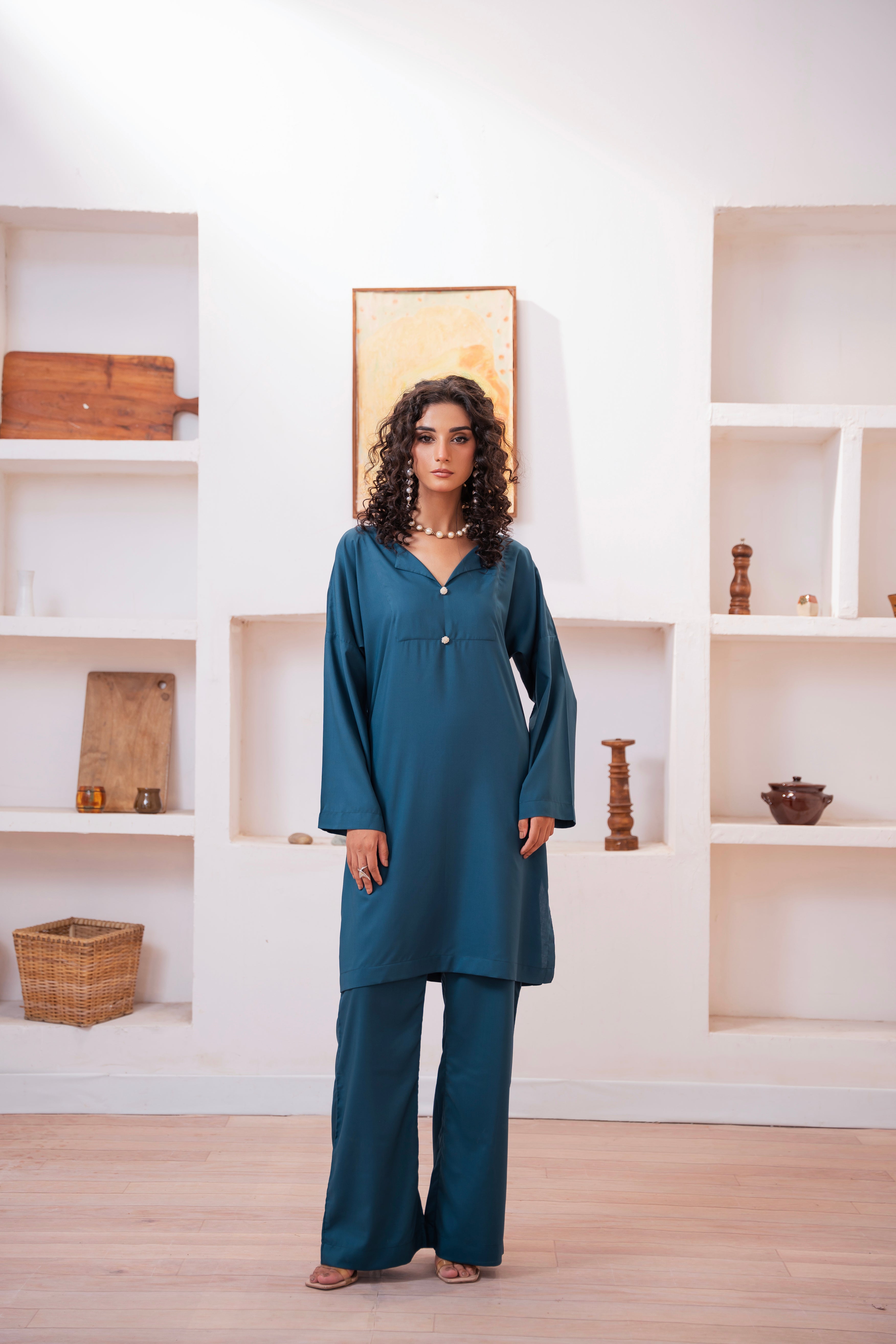 This two-piece dress includes a stylish shirt and tailored trouser. This dress is crafted from our new soft crepe fabric, known for its sweat-absorbing properties, ensuring comfort throughout the day. Designed to blend contemporary Western styles with subtle traditional touches. The dress is shown here in size small, perfectly fitted on the model. Length of Shirt, Sleeve Opening & Shirttail are as per Design. Actual color may vary slightly from what appears on your screen due to lighting.